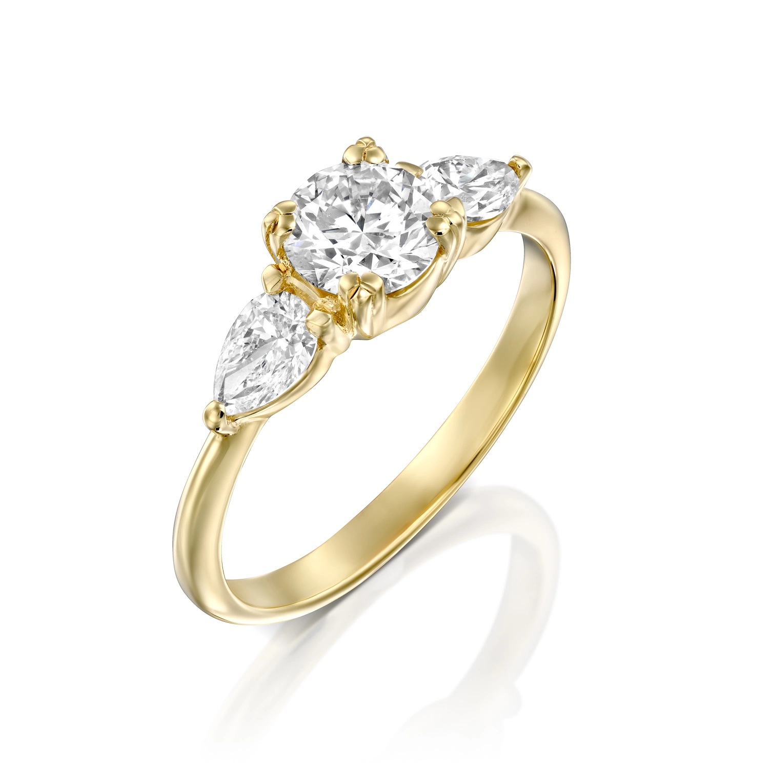 טבעת אירוסין יפהפיה, משובצת שלושה יהלומים, כאשר המרכזי עגול ולצידו זוג יהלומים בצורת טיפה. טבעת מיוחדת מאוד, עדינה ומרשימה.