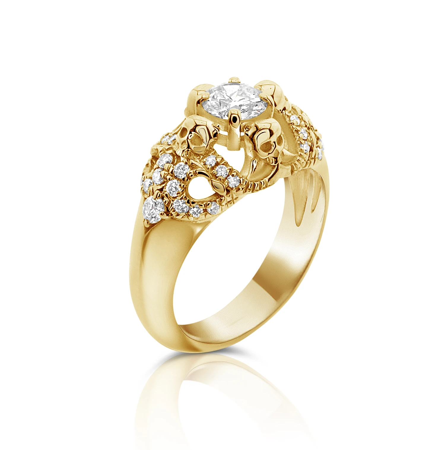 טבעת יהלומים מיוחדת במינה מעוצבת עם 4 דמויות של גולגולות שמחזיקות את היהלום המרכזי.