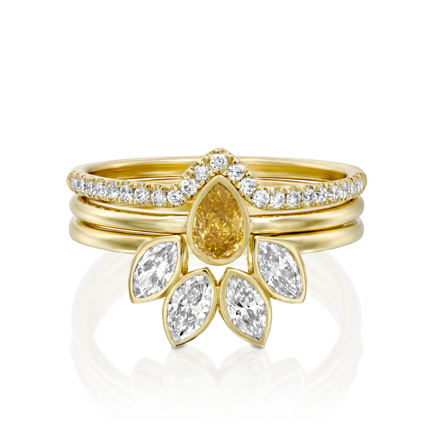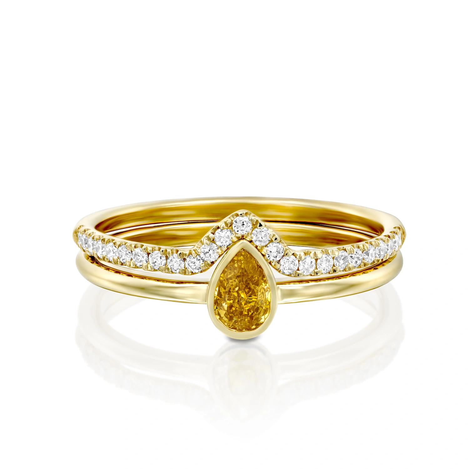 טבעת עדינה ומהפנטת, משובצת בתוך מסגרת זהב יהלום טבעי בצורת טיפה בצבע צהוב עמוק וצלול