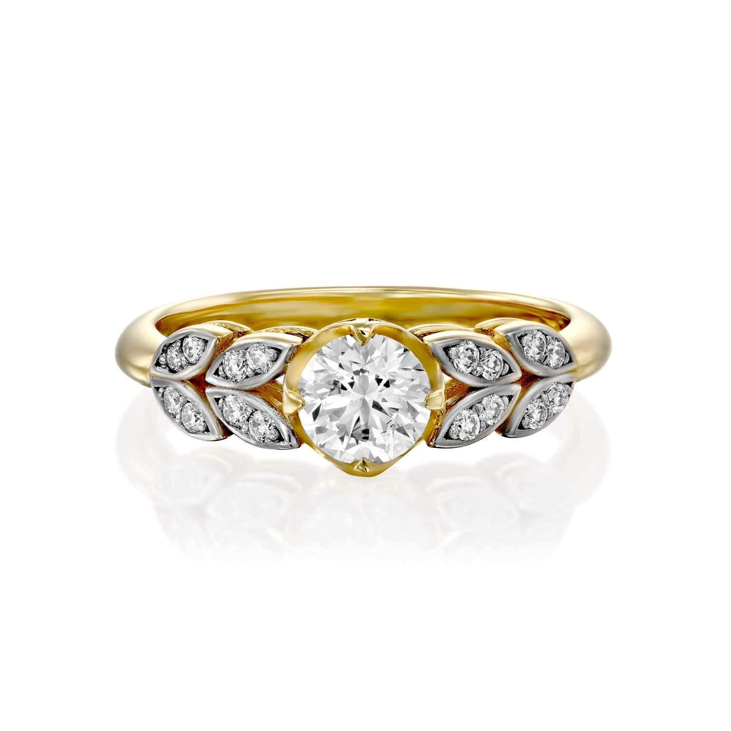 טבעת אירוסין מעוצבת בסימן פריחה וצמיחה. הטבעת משובצת אבן 5ממ ומצדדיה מעוטרת ב 8 עלים משובצים ביהלומים קטנים.