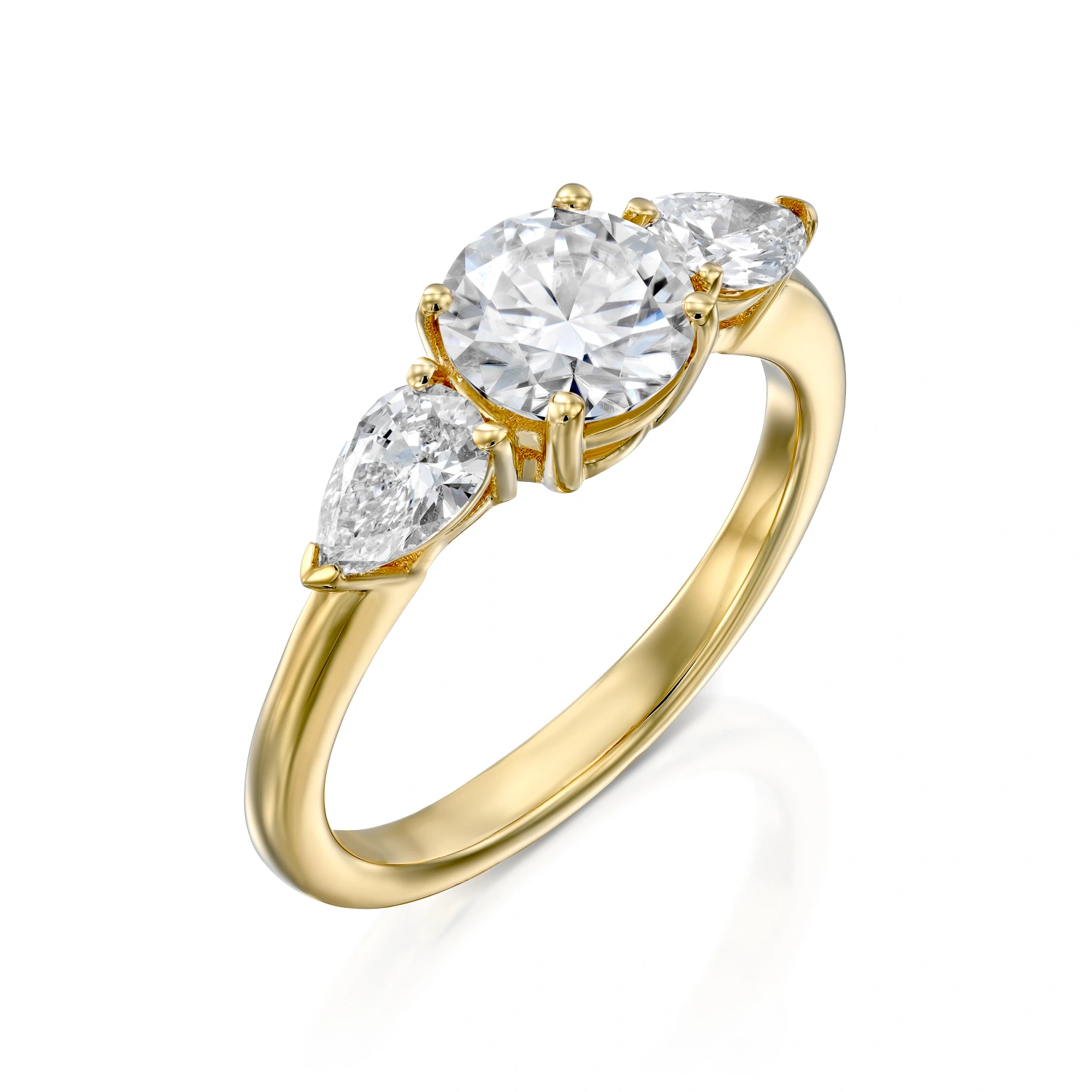 טבעת מהחלומות! משובצת יהלום מרכזי עגול ומצדדיו זוג יהלומים בצורת טיפה. שלושת היהלומים יוצרים מראה עוטף של יהלומים על האצבע.